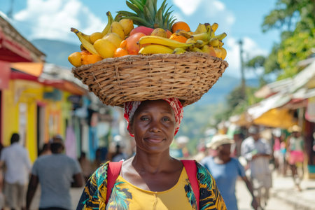 Smiling Jamaican street vendor carrying large wicker basket of colorful fresh tropical fruit on her head in a bustling outdoor marketplace