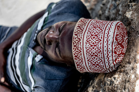 Zanzibar, Tanzania - january 14, 2020: African man on the street near home of Zanzibar island, Tanzania, East Africa, close up