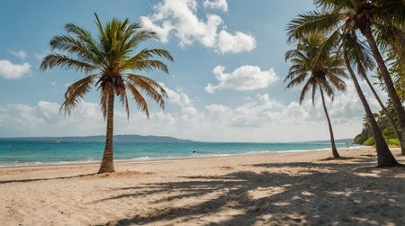 A picturesque tropical beach with a tall palm tree, lush greenery, and a clear blue ocean under a bright, cloudy sky.