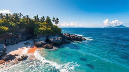 Beautiful tropical beach with coconut palm palms and a clear blue water as seen from above.