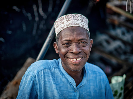 Zanzibar, Tanzania - january 03, 2020: African man on the street market of Zanzibar island, Tanzania, East Africa, close up