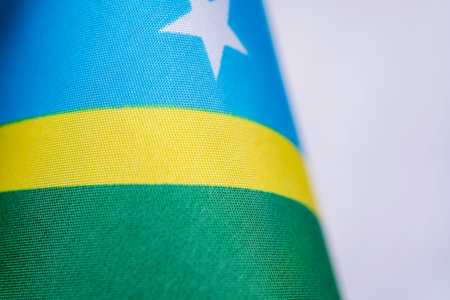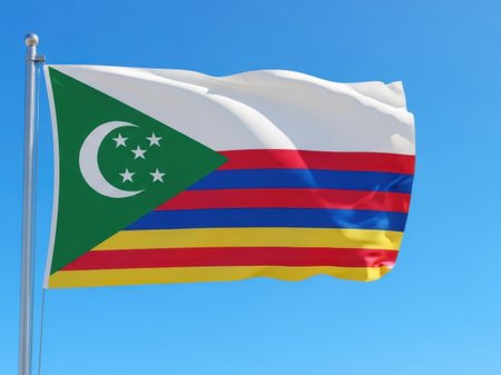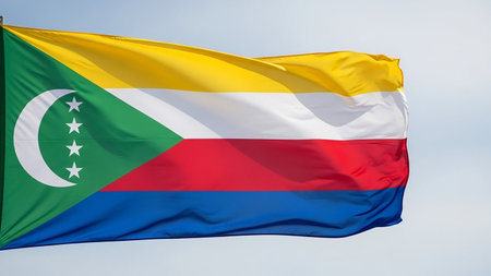 The flag of Comoros, featuring a green vertical stripe with a white crescent and four stars, waves in the wind against a pale sky.