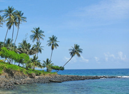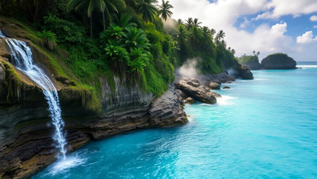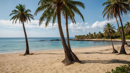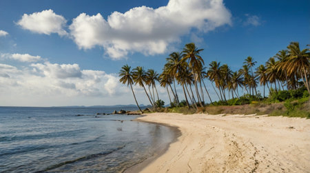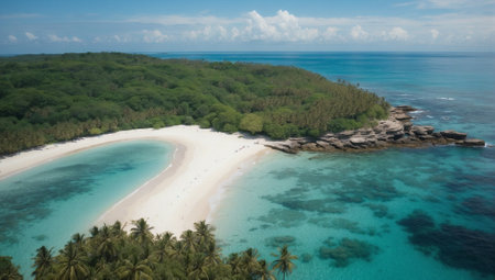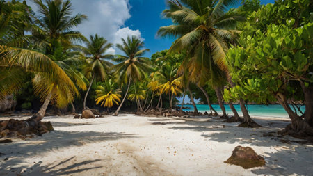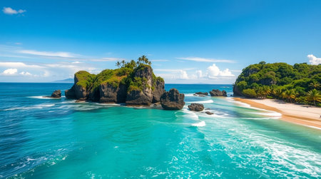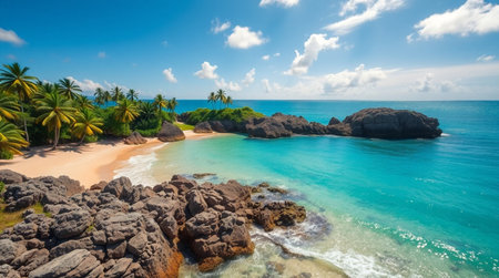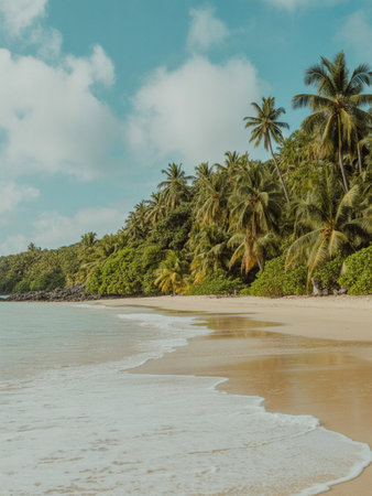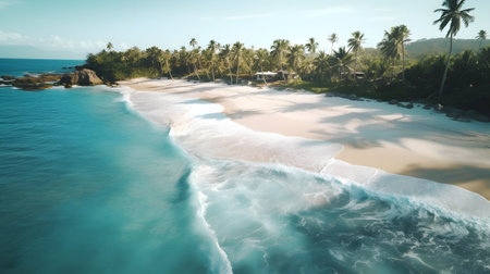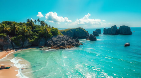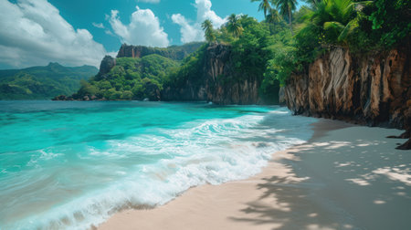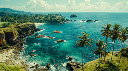 Tranquil and serene tropical beach paradise with secluded sandy beaches, lush greenery, and palm trees for a perfect vacation destination