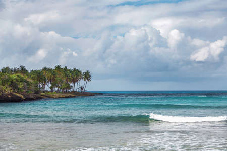 sea surf in Samana, Dominican Republic. Sea, shore with palm trees and sky with storm clouds