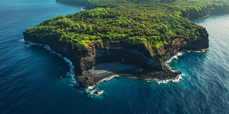 Aerial view of black volcanic sand beach with waves breaking on the shore