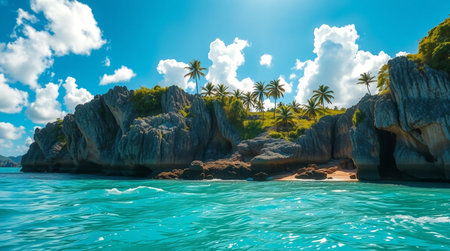 Discover a breathtaking tropical coastline featuring clear turquoise water, rugged rocks, and lush palm trees under a vibrant blue sky and fluffy clouds.