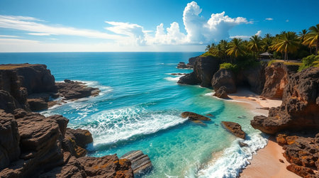 A breathtaking view of a rocky coastline featuring palm trees, turquoise waters, and waves gently crashing against the shore, embodying the tranquility of nature's beauty.