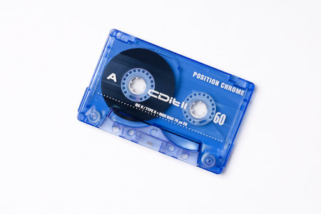 Old audio cassette isolated on white background. Historical records sound on a magnetic tape. Place for your text.