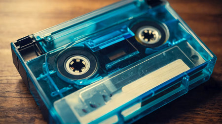 Transparent audio cassette casting a shadow on a bright blue surface for retro music themes