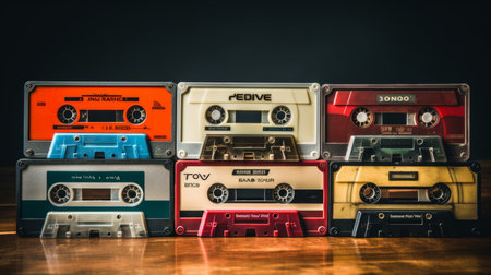 Retro cassette tapes in an array of vivid hues. Top view. Background. Concept of vintage music, collectible items, the 80s and 90s culture, and the charm of physical media. Banner