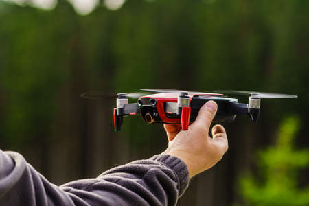 Modern small compact quadcopter in a mans hand. Launching a drone from your hand