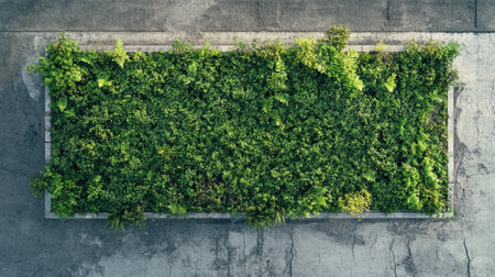 A lush green patch of plants flourishes amidst a stark concrete cityscape, illustrating the ongoing shift towards sustainable living.