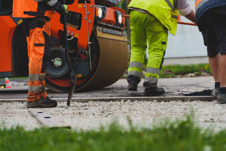 Process of asphalting, blacktopping and paving, asphalt paver machine and steam roller compactor during construction and repairing works, workers on construction site, rental vehicle working