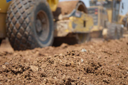 Soil Compactor the leveling ground for construct of foundation. Vibration road roller compresses soil for formwork foundation. Wheel loader on groundwork at construction site.