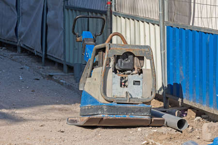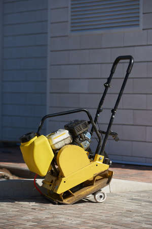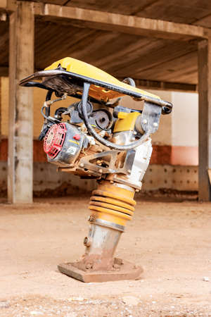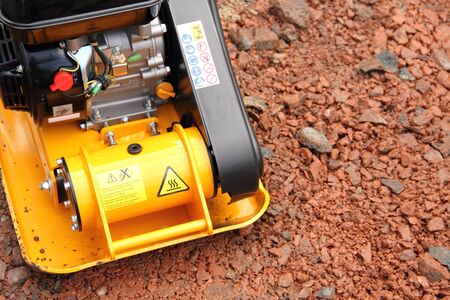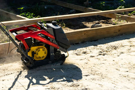 Vibratory rammer with vibrating plate on a construction site. Compaction of the soil before laying paving slabs. Close-up