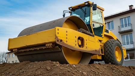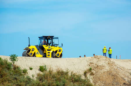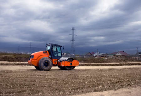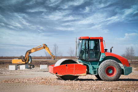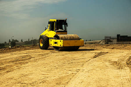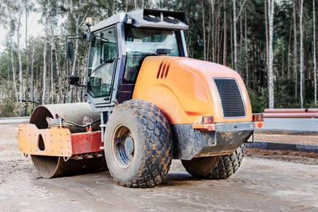 Modern road roller on a construction site. Heavy duty construction equipment.