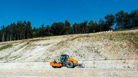Germany - Aug 22, 2019: Orange HAMM H 13i roller and compactor for soil and asphalt compaction the construction site repair of German autobahn