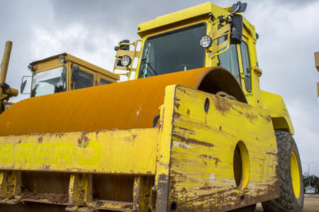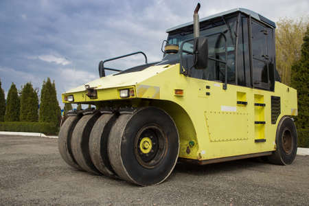 large light yellow roller for paving work. Improvement of the city. Equipment for road construction and repair, rent, purchase, leasing