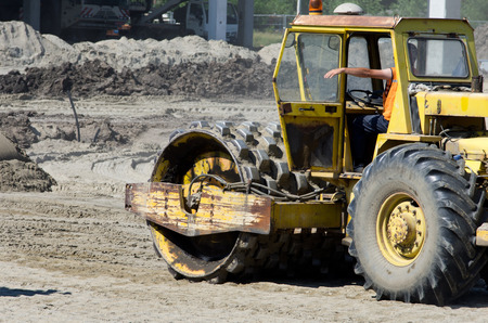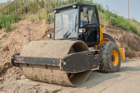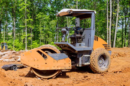 Soil Compactor at construction site. Vibration single-cylinder road roller for leveling soil, gravel, concrete, or asphalt in the construction of roads and foundation. Road Construction Equipment