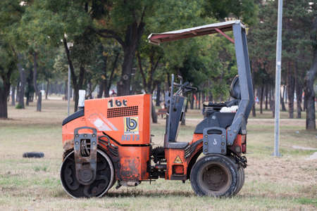 BELGRADE, SERBIA - AUGUST 21, 2018: Road roller, small model, on display in the streets of Belgrade. A road roller, or compactor, is used for asphalt and road renovation and construction.