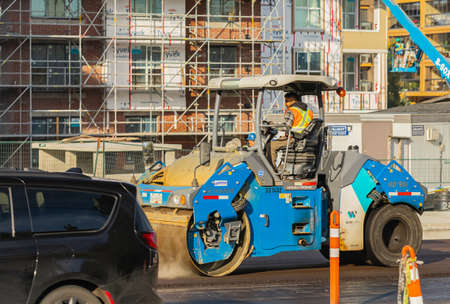 Tracked paver laying fresh asphalt pavement on top of the gravel base during road construction. Road construction works with roller compactor machine-October 19,2021-Langley BC, Canada. Street photo