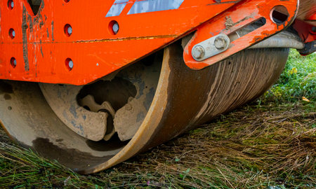Close up details of industrial road soil compactor, vibratory roller and heavy duty machinery during highway construction