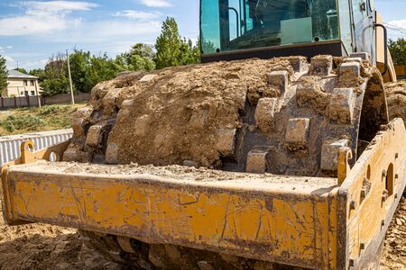 large vibratory roller compacts the soil. Preparatory road works. Rent, buy lease.