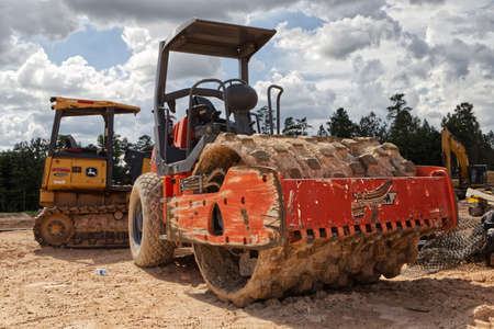 Augusta, Ga USA - 09 10 21: Construction site metal wheel roller heavy industrial machinery