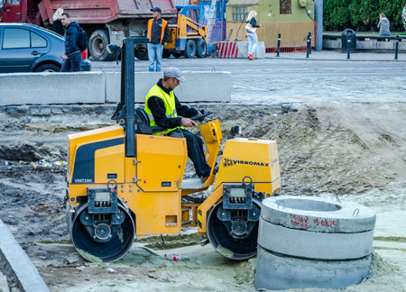 Lviv, Ukraine - September 2015: Tractor rams sand on the road reconstruction on Liberty Avenue in Lviv