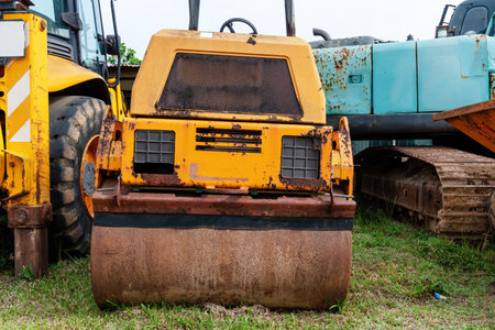 Yellow road roller with a rusty exterior stands on grass. Heavy industrial equipment theme