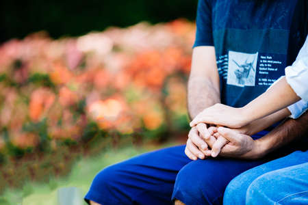 Hands of an elderly couple, close-up. Olderly couple holding hands during walking. Love concept. Concept of take care mature together.
