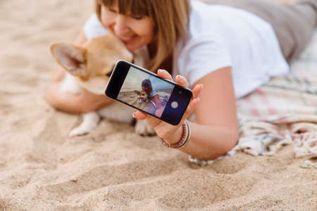 Senior woman taking photo on cellphone while resting with her dog on sandy beach