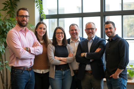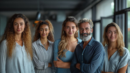 A group of diverse colleagues stand together, smiling and looking at the camera. They appear to be in a modern office building, with a glass wall in the background. The group includes two women with long hair, two women with short hair, and two men with different hair styles.