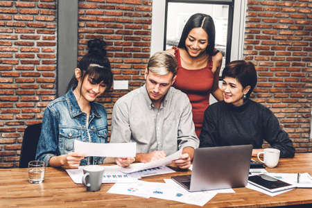 Group of casual business discussing and working with laptop computer.creative business people planning and brainstorm in modern workloft.Teamwork concept