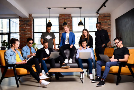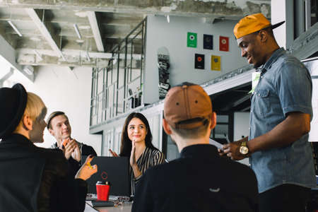 A friendly atmosphere in the office. Young, confident employees of the multiracial team discuss tasks and laugh at the morning meeting