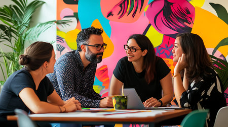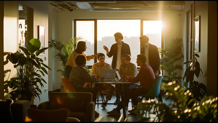 A diverse team engages in a productive meeting brainstorming ideas in a vibrant office setting.