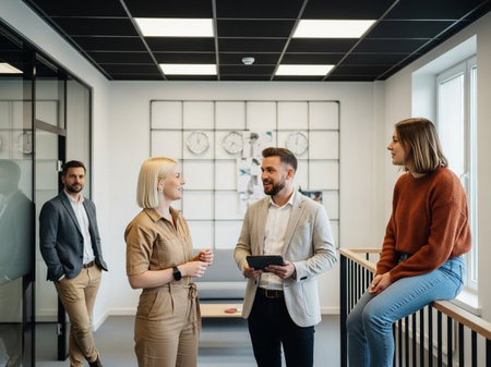 Four coworkers in business casual attire engage in conversation in a contemporary office setting with glass walls and a grid patterned wall decoration