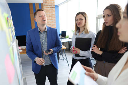 African american man in casual wear standing near the glass office wall with financial points, explaining planning and business strategies to colleagues, creative solutions on brainstorming session.