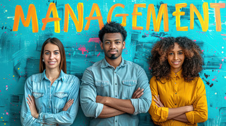 Multiethnic group of young people standing in front of a wall with the word MANAGEMENT