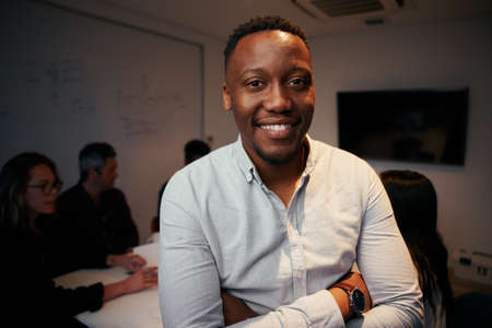 Portrait of a confident young businessman looking at camera while his colleague at background