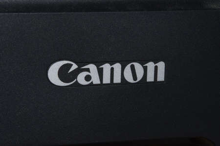 Kyiv, Ukraine, May 28, 2021. Canon logo on rough black plastic. The inscription Canon on a black background. Editorial illustration.