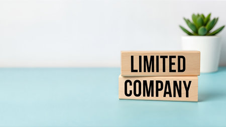Concept of Limited Liability Company represented by wooden blocks on a blue surface, with a small green plant in a white pot, illustrating business and growth ideas