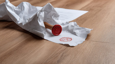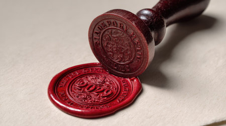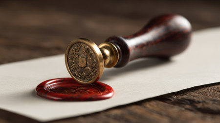 This image features a vintage wax seal stamp resting on beige paper, showcasing an intricate design with vibrant red wax. Ideal for themes of tradition and authenticity.