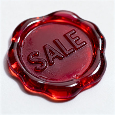 Close-up of a red wax seal with the word SALE embossed in bold letters, placed on a white surface. Represents discounts, promotions, and special offers.