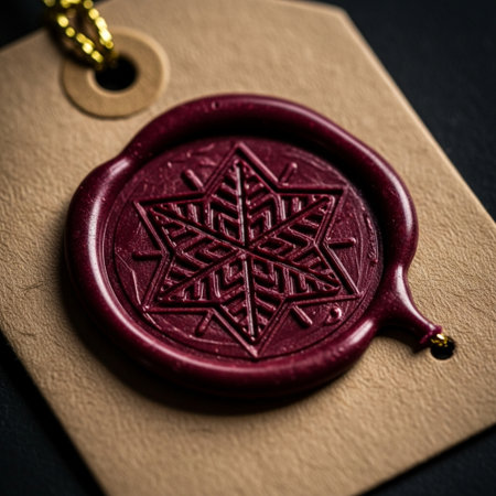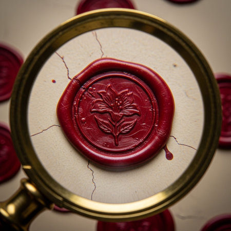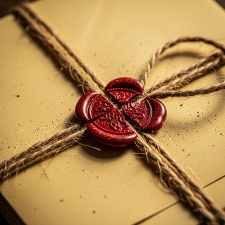 Square 1:1, Hero Detail shot focusing on the texture and intimacy of an antique red wax seal binding