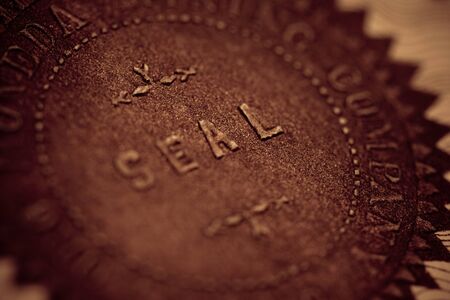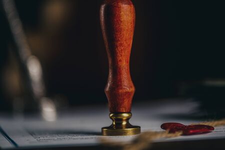 Vintage wax seal on a wooden surface. Selective focus. Toned.