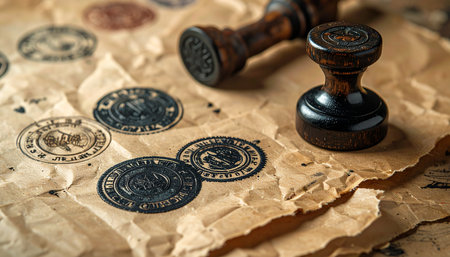A collection of antique wax seals and hand stamps rests on aged parchment, evoking a sense of history and officialdom.