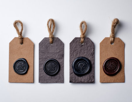 Four tags with distinct wax seals are displayed against a white backdrop.