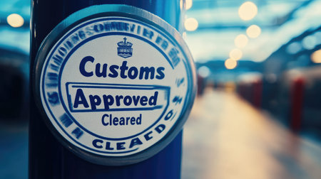 A close view of a customs approval seal displayed on a blue column, representing clearance and compliance in a bustling industrial warehouse setting.