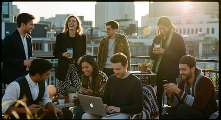 A diverse group of young professionals socializing and working on laptops on a rooftop during sunset in a city setting.